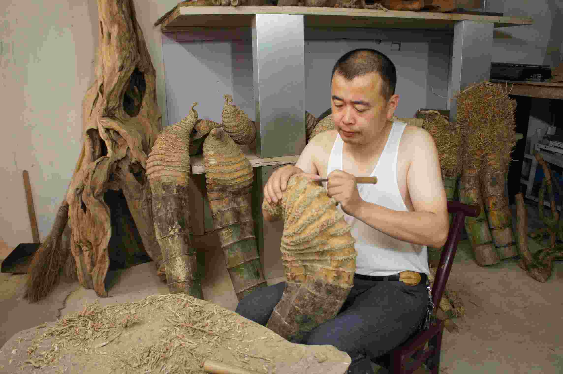 皖南根雕所用的根材種類是當地生長的香樟、黃荊、杜鵑、榆樹、櫸、三角楓、紫薇、梅、毛竹、紫竹根等幾十種,除竹根外不能挖活根,而是以山塘水庫中漂浮沉底的枯樹根,埋于河床、地下的千年陰沉木,廢棄于山野、林間、路旁的殘樹樁、枯根、朽木等為材料,不同的雕刻品種又有不同的材質材形要求。