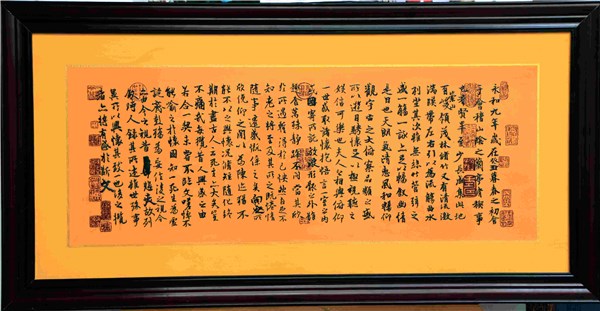 重要價值和影響:髹漆匾額、楹聯、壁掛、招牌,明示牌等是在繼承堆漆、刻漆等傳統工藝的基礎上,采用天然生漆等材料,并按照其特點,嚴格參照古法純手工制作而成。既有雕刻的立體效果,又不失書法原有的韻味和風格。 具有很強的抗腐蝕能力,是用髹漆技術在不同載體上還原書法造型的藝術品。髹漆匾額,除了御賜,標名教化作用外,歷代名士還利用它的傳播價值,作為自我信念品行的一種彰顯,擴展了匾額的功能,因深具藝術價值,美學價值、文物價值、歷史價值、研究價值、鑒賞價值和學術價值。匾額已成為研究民族文化發展的實物例證,對其詳盡研究和梳理,每方匾額無凝是一件不可多得的書法精品的再現。 對于書法愛好者具有一定的借鑒和欣賞價值;而對于研究地方史來說也是一份十分珍貴的研究資料。