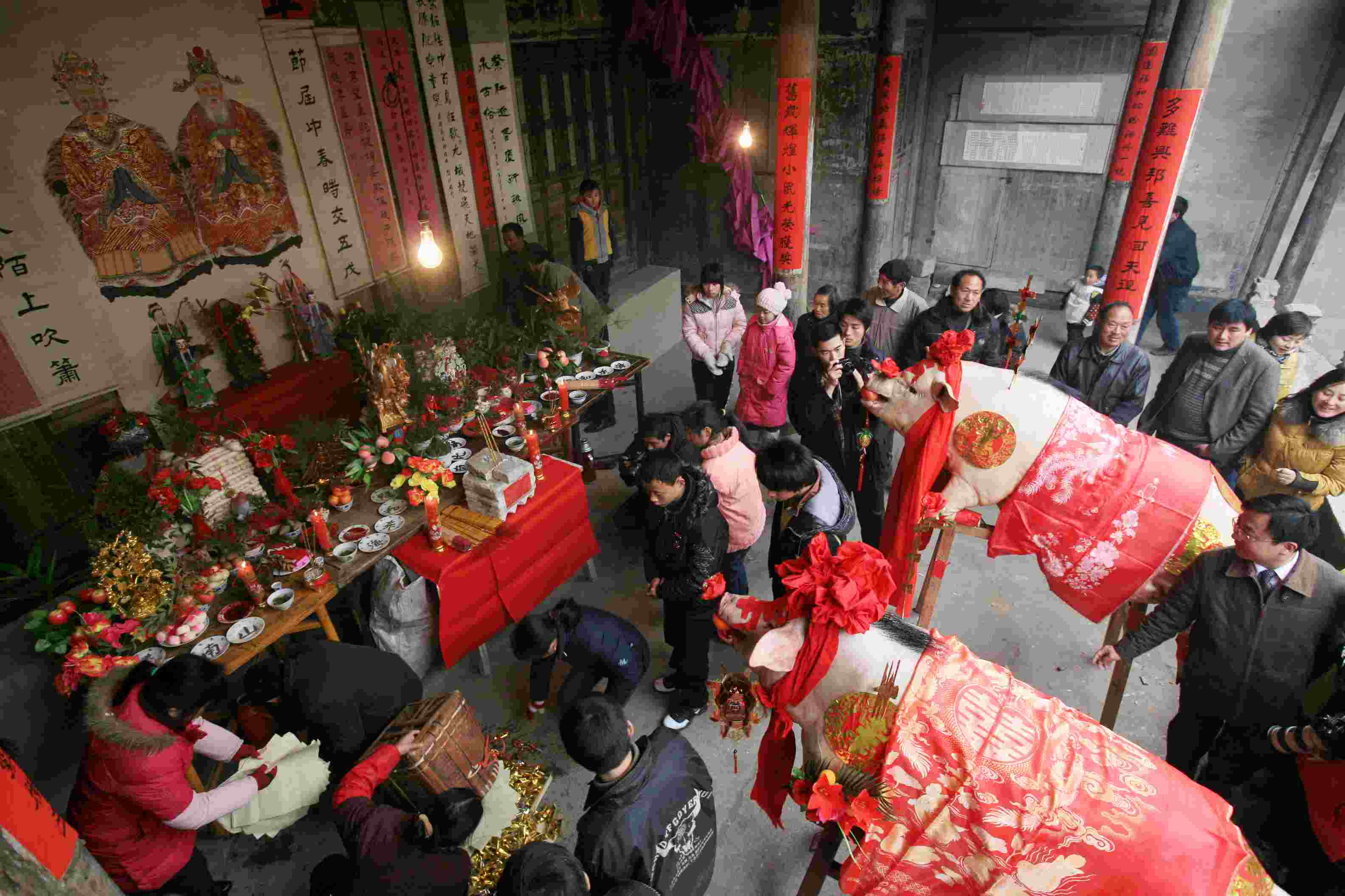 祭祀這一民間信俗于明代初期在績溪縣伏嶺鎮北村始起。舉辦時間為每年的除夕夜凌晨起至大年初一日。該活動頗具徽州文化元素,集中展示了古徽州的民風民俗,是徽州典型且具有代表性的民間信俗活動。 除夕凌晨宰殺三牲貢品,后將三牲打扮完畢,下午將“社豬”、“社羊”、“社雞”及其他貢品送入祠堂,迎接社神(神的牌位)進入祠堂。 “春分”當日上午,恭送社神回廟,同時,分贈“社饅”給20歲以上男子。一般在“春風”日下午舉行隆重的“祭社”儀式。祭社活動按固定的程序,工作程序與規則進行。儀式程序為“序立”、“降神”、“奠帛行初禮”、“鼓樂”、“右食”、“右樂”、“讀祝”、“辭神鞠躬拜”、“化財”、“望燎”、“撤饌”、“禮畢”十二個程序進行。 “春分”第二日,所有三牲貢品及“瓊碗”擱置祠堂一天。次日凌晨時分,四十歲男子將三牲等貢品擺放置“社公廟”,祭拜“社公”。祭祀物品有:社公社母圖像、程氏人物記、牌位等交辦下屆四十值年男子。晚上全村所有36歲男子玩舞板凳龍。祭祀活動在北村興起后,至今延續不斷,得到了很好的保護和傳承。 祭社民俗活動,祈求風調雨順,五谷豐登,人壽年豐,國泰民安,是當地百姓舉辦民間信俗活動的宗旨。 祭社均由北村程氏男丁值年40歲男子擔任,而“擎龍燈”活動由全村所有36歲男子組成,形成全村參與的良好格局。