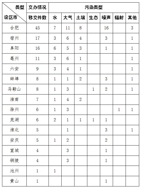 截至11月15日9時,我省收到中央第二生態環境保護督察組轉辦的第二十六批群眾信訪舉報件153件,涉及環境問題153個。其中,大氣環境問題53個、噪聲問題34個、水環境問題30個、土壤問題22個、其他污染問題11個、生態問題2個、輻射問題1個。第二十六批轉辦信訪件涉及16個地市,分別是:合肥市(45件)、宿州市(17件)、阜陽市(16件)、亳州市(11件)、六安市(9件)、蚌埠市(8件)、馬鞍山市(8件)、淮南市(7件)、滁州市(6件)、蕪湖市(6件)、安慶市(5件)、淮北市(5件)、宣城市(4件)、銅陵市(4件)、池州市(1件)、黃山市(1件)。
