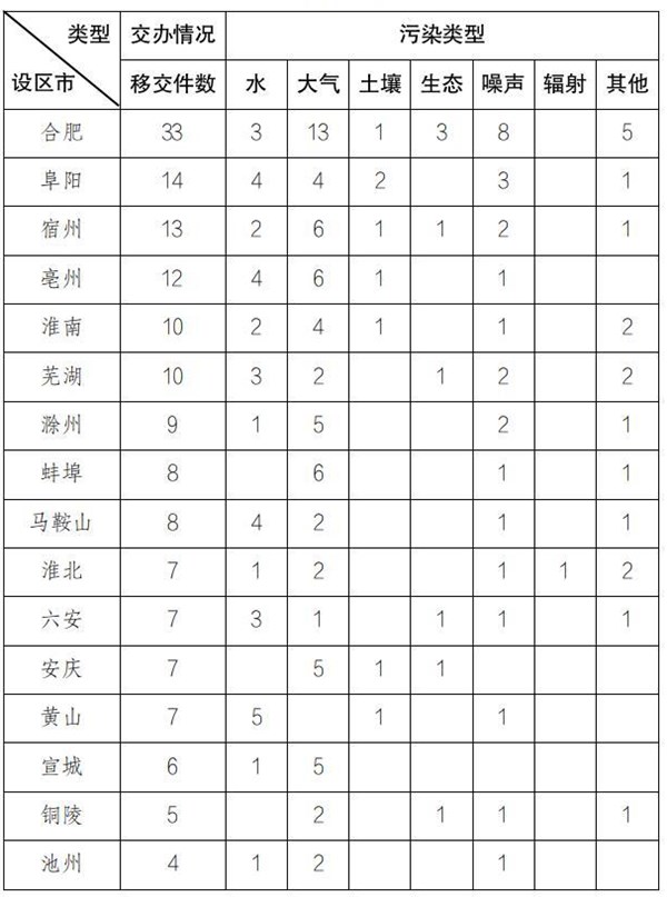 截至11月16日9時,我省收到中央第二生態環境保護督察組轉辦的第二十七批群眾信訪舉報件160件,涉及環境問題160個。其中,大氣環境問題65個、水環境問題34個、噪聲問題26個、其他污染問題18個、土壤問題8個、生態問題8個、輻射問題1個。第二十七批轉辦信訪件涉及16個地市,分別是:合肥市(33件)、阜陽市(14件)、宿州市(13件)、亳州市(12件)、淮南市(10件)、蕪湖市(10件)、滁州市(9件)、蚌埠市(8件)、馬鞍山市(8件)、淮北市(7件)、六安市(7件)、安慶市(7件)、黃山市(7件)、宣城市(6件)、銅陵市(5件)、池州市(4件)。