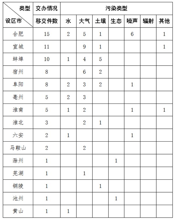 11月26日9時,我省收到中央第二生態環境保護督察組轉辦的第三十三批群眾信訪舉報件74件,涉及環境問題74個。其中,大氣環境問題37個、土壤問題13個、水環境問題10個、噪聲問題9個、其他污染問題3個、生態問題2個。第三十三批轉辦信訪件涉及15個地市,分別是:合肥市(15件)、宣城市(11件)、蚌埠市(10件)、宿州市(8件)、阜陽市(8件)、亳州市(5件)、淮南市(5件)、淮北市(3件)、六安市(2件)、馬鞍山市(2件)、滁州市(1件)、蕪湖市(1件)、銅陵市(1件)、池州市(1件)、黃山市(1件)。