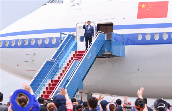 當地時間4月14日中午,中共中央總書記、國家主席習近平乘專機抵達河內,應越南共產黨中央委員會總書記蘇林、越南社會主義共和國主席梁強邀請,對越南進行國事訪問。習近平乘專機抵達河內內排國際機場時,越南國家主席梁強,越共中央政治局委員、中央書記處常務書記陳錦繡,越共中央書記處書記、中央辦公廳主任黎懷忠等越南黨政領導人和地方代表熱情迎接。新華社記者 李學仁 攝