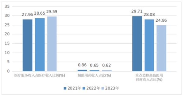 2 2021-2023年三級公立醫院醫療服務收入、輔助用藥收入及重點監控高值醫用耗材收入占比情況