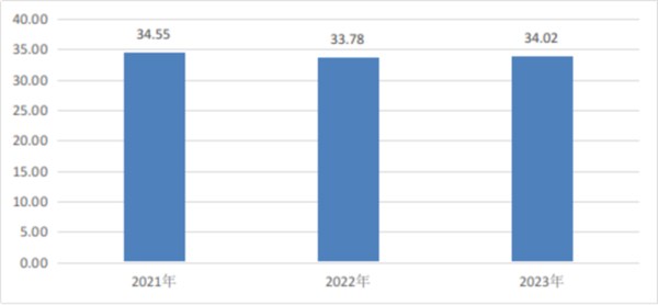 四是合理用藥水平進一步提升。2023年,全國三級公立醫院抗菌藥物使用強度為34.02(見圖8),86.65%的三級公立醫院的抗菌藥物使用強度符合國家要求。點評處方占處方總數的比例、點評出院患者醫囑比例分別為19.30%和23.42%,較2022年提升0.97個和1.34個百分點,有力支撐合理用藥水平提升。